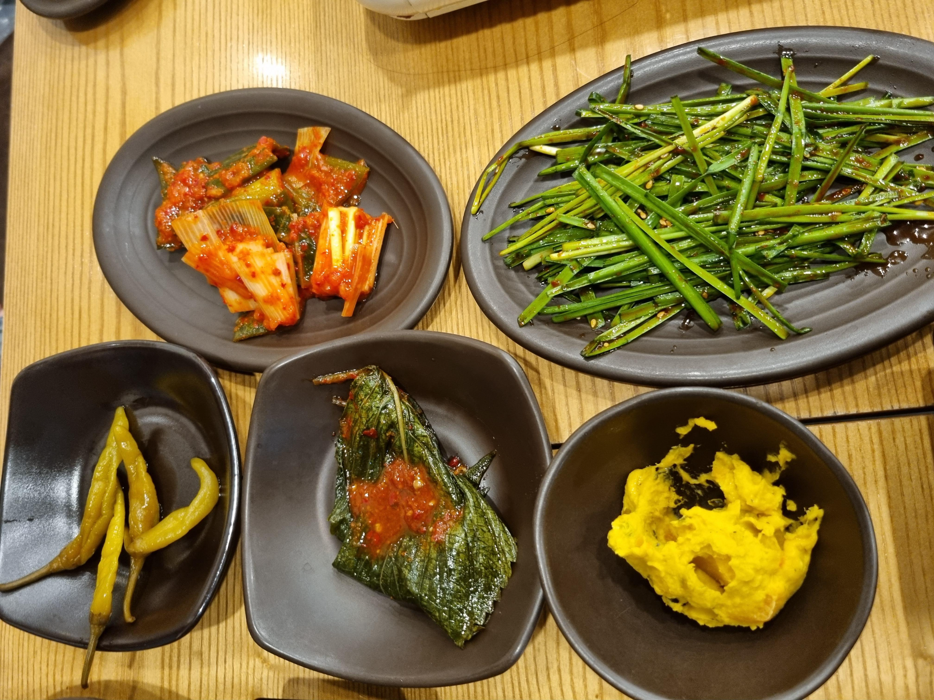 밑반찬으로 나온 김치와 부추, 고추장아찌 (?), 깻잎 입니다.