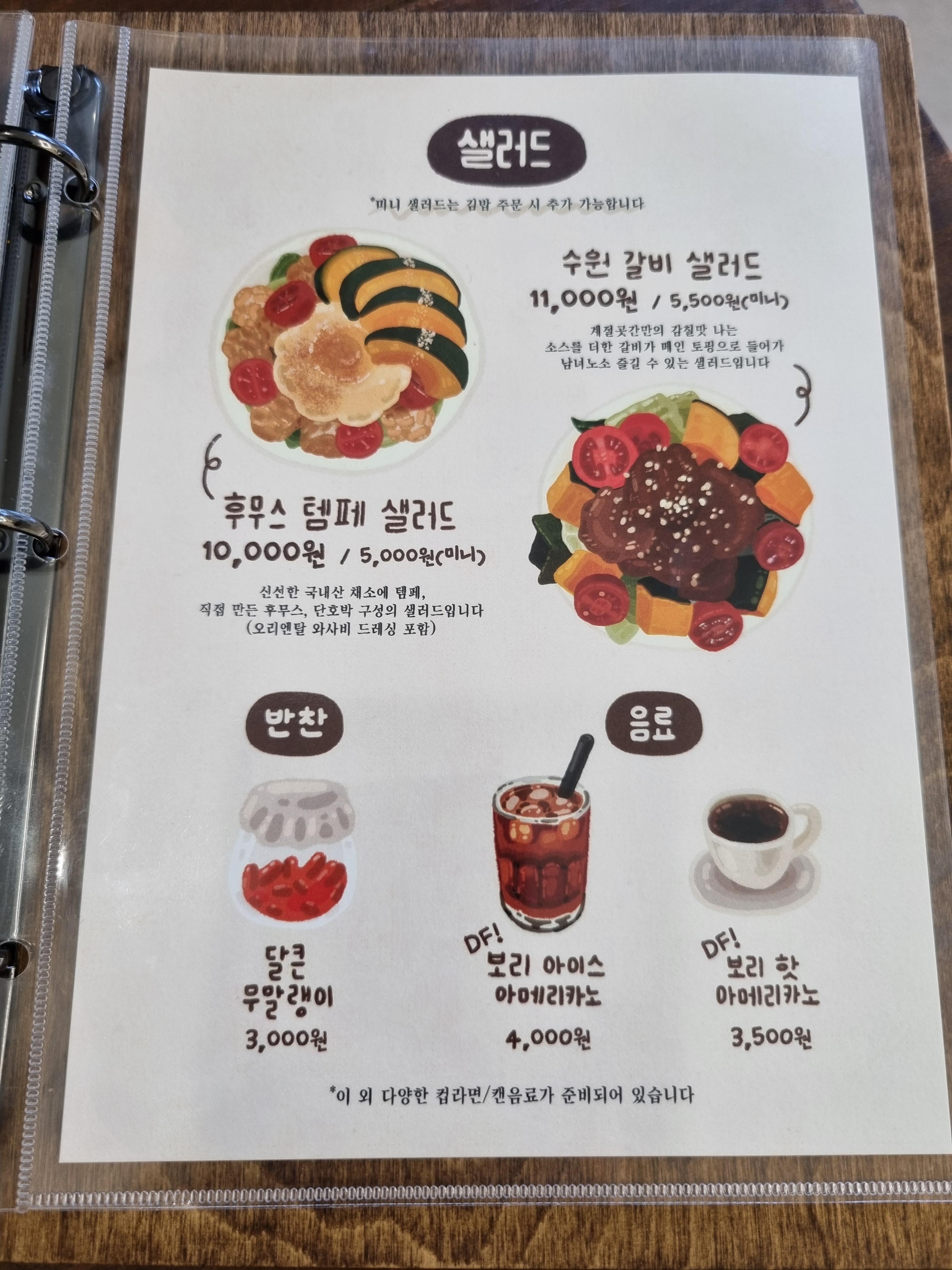 후무스 템페 샐러드 그리고 수원 갈비 샐러드의 가격은 10,000원입니다.