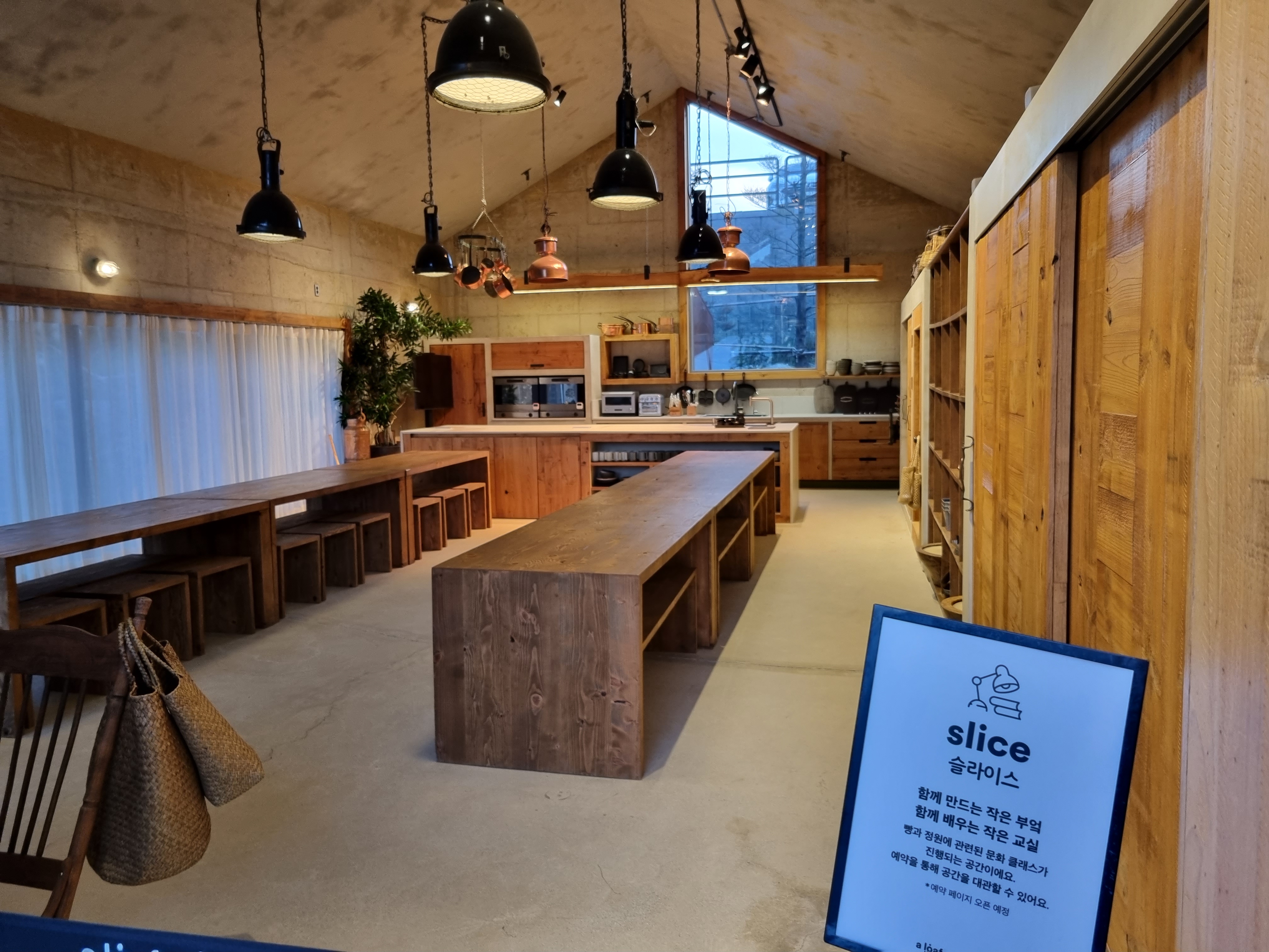 제가 방문했을때 운영중이진 않았찌만 이렇게 빵 만드는 법을 배우는 클라스가 운영되는 슬라이스이라는 이름의 공간과 파티를 할 수 있는 파티룸 피스 공간도 있습니다.