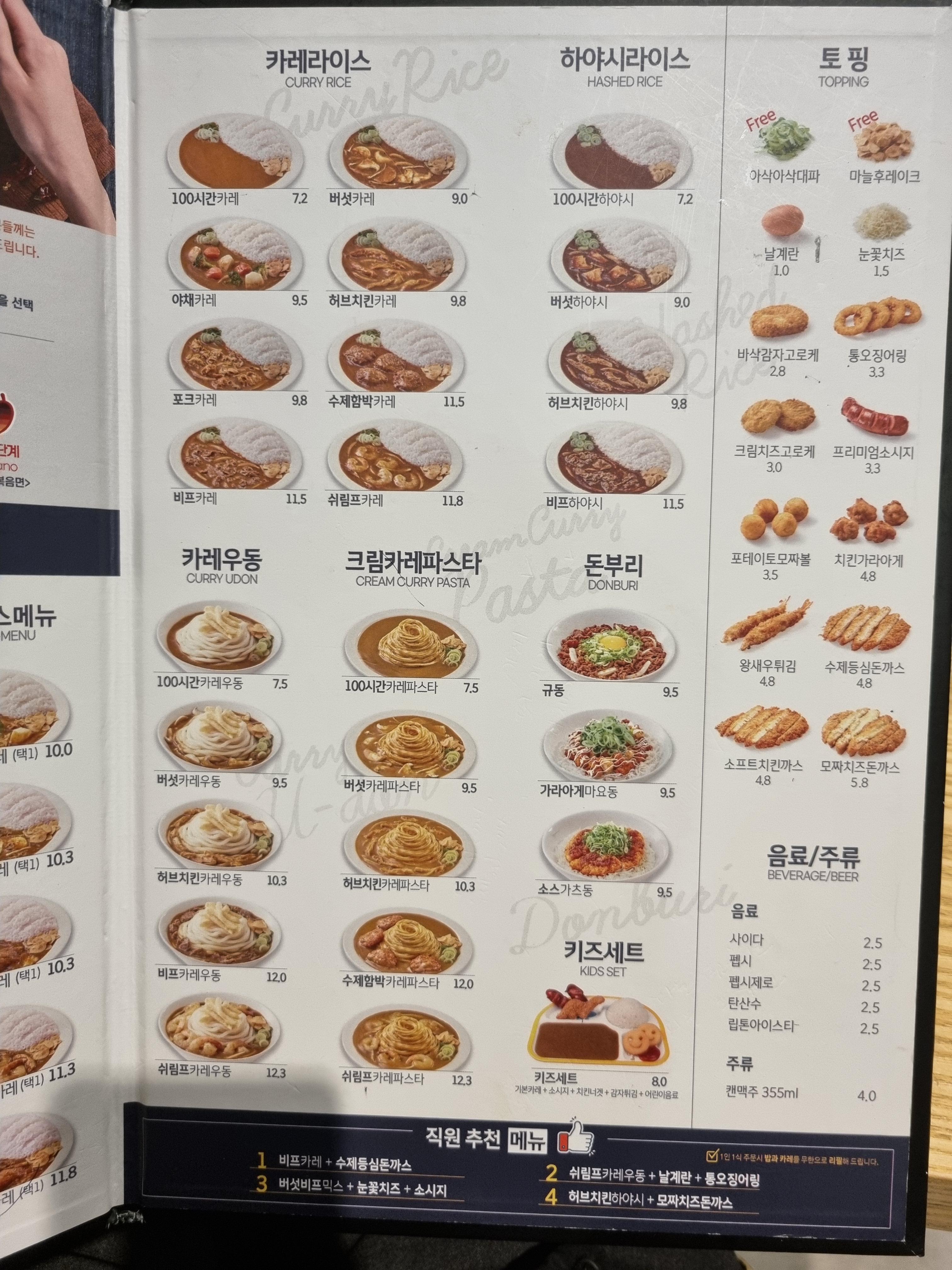 카레 자체의 맛이 너무 강하기에 기본 카레가 아닌 다른 카레를 주문해도 비슷했으리라 생각됩니다.