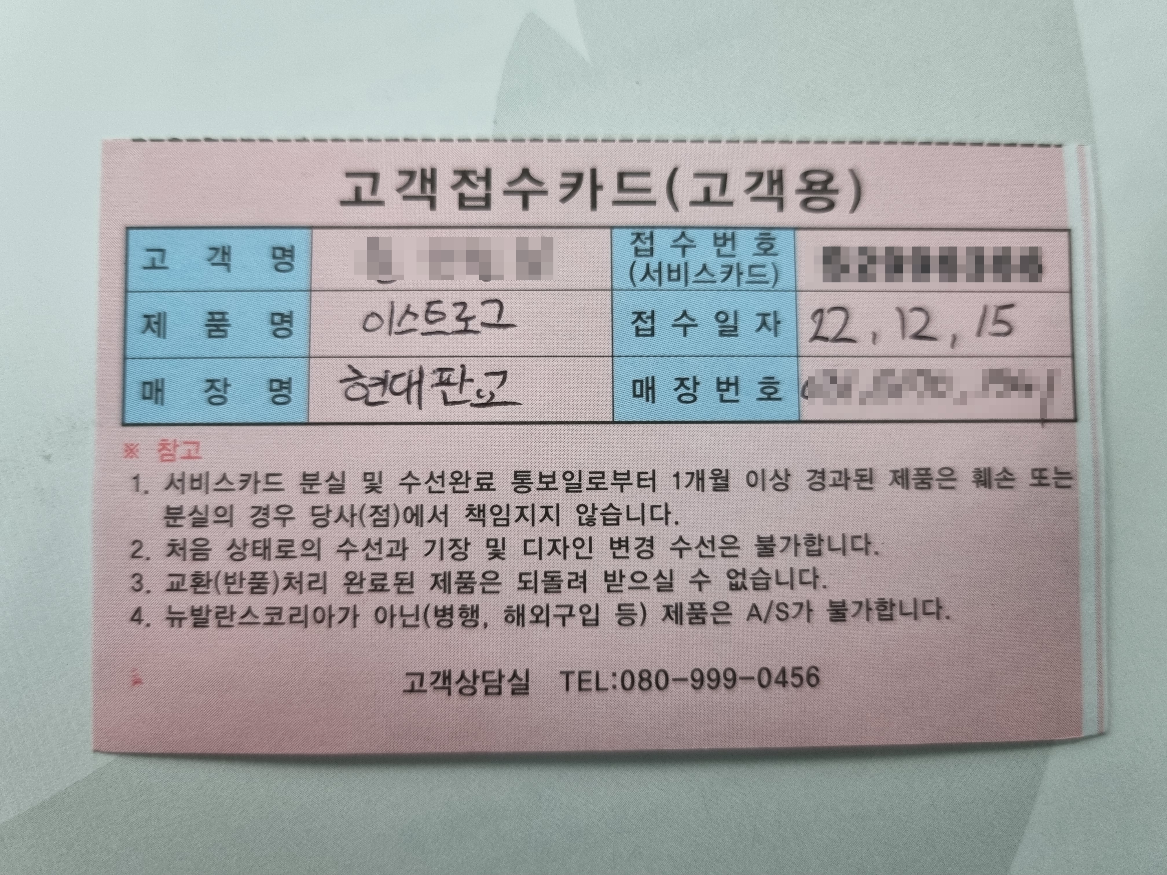 구매 후기를 작성하는 과정에서 아래 사진처럼 제품 불량인 부분이 확인되었고 이 부분을 A/S 하기 위해 판교 현대 백화점에 방문했습니다.