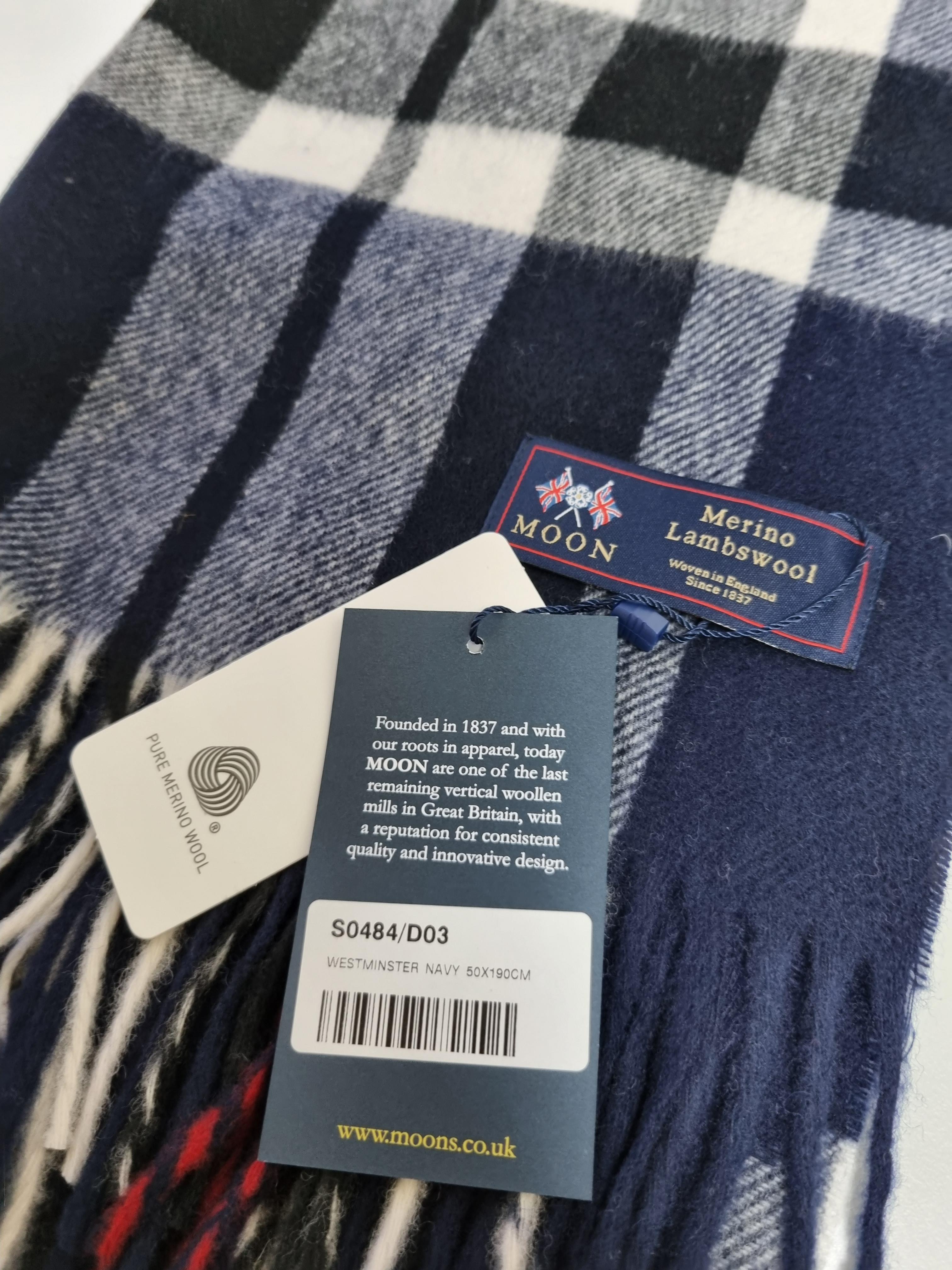 메리노 램스울로 만들어졌음을 표시하는 텝이 눈에 띄며 블랙 또는 네이비 컬러 코트에 포인트도 줄 수 있고 무난하게 잘 어울리는 웨스트민스터 네이비 색상의 목도리입니다.